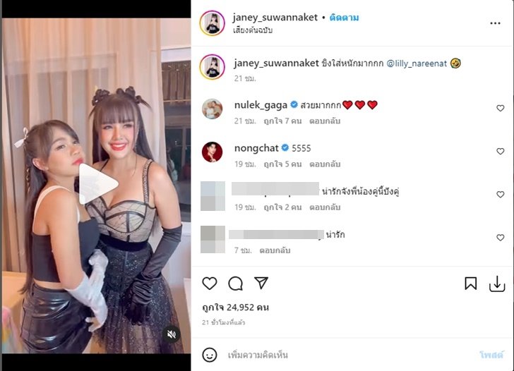 และอีกโพสต์ภาพนิ่งที่เจนนี่นำมาลงก็มากับแคปชั่นว่า "ไม่ถนัดรักษาหุ่น ถนัดรักษา “คุณ” มากกว่า >< @lilly_nareenat" ซึ่งก็มีหลายๆ คนที่พูดถึงความสวยของสองพี่น้องในลุคนี้เช่นกัน