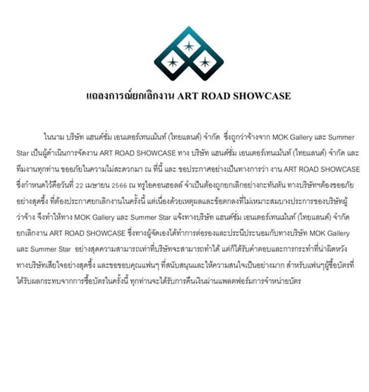 และ ขอประกาศอย่างเป็นทางการว่า งาน ART ROAD SHOWCASE ซึ่งกำหนดไว้คือวันที่ 22 เมษายน 2566 ณ ทรูไอคอนฮอลล์ จำเป็นต้องถูกยกเลิกอย่างกะทันหัน ทางบริษัทฯต้องขออภัยอย่างสุดซึ้ง ที่ต้องประกาศยกเลิกงานในครั้งนี้